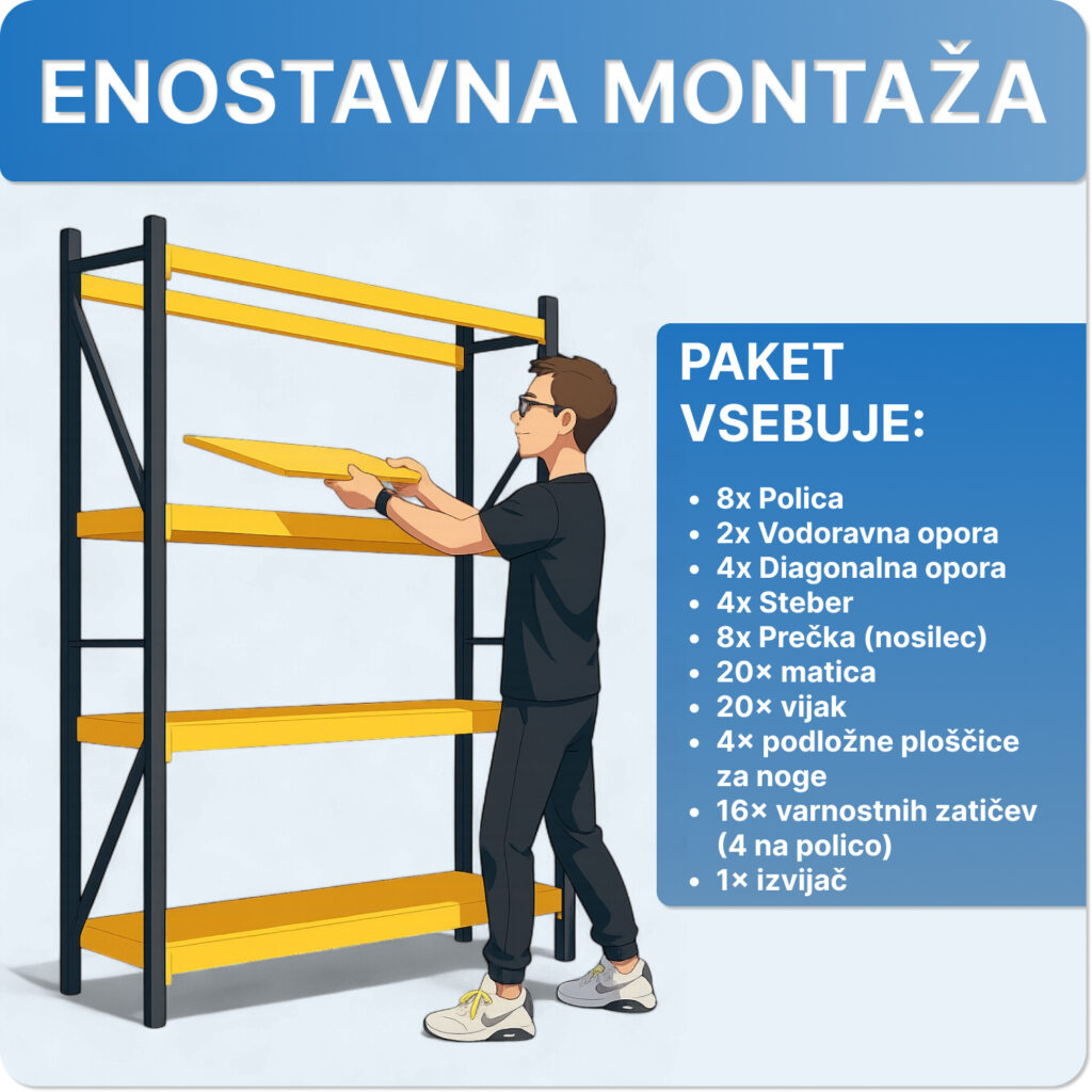 Regal je zasnovan za preprosto in intuitivno montažo, brez potrebe po posebnem orodju ali strokovni namestitvi. Vsi potrebni deli so vključeni v paketu, nastavljiva višina polic pa omogoča prilagoditev glede na velikost shranjenih predmetov.