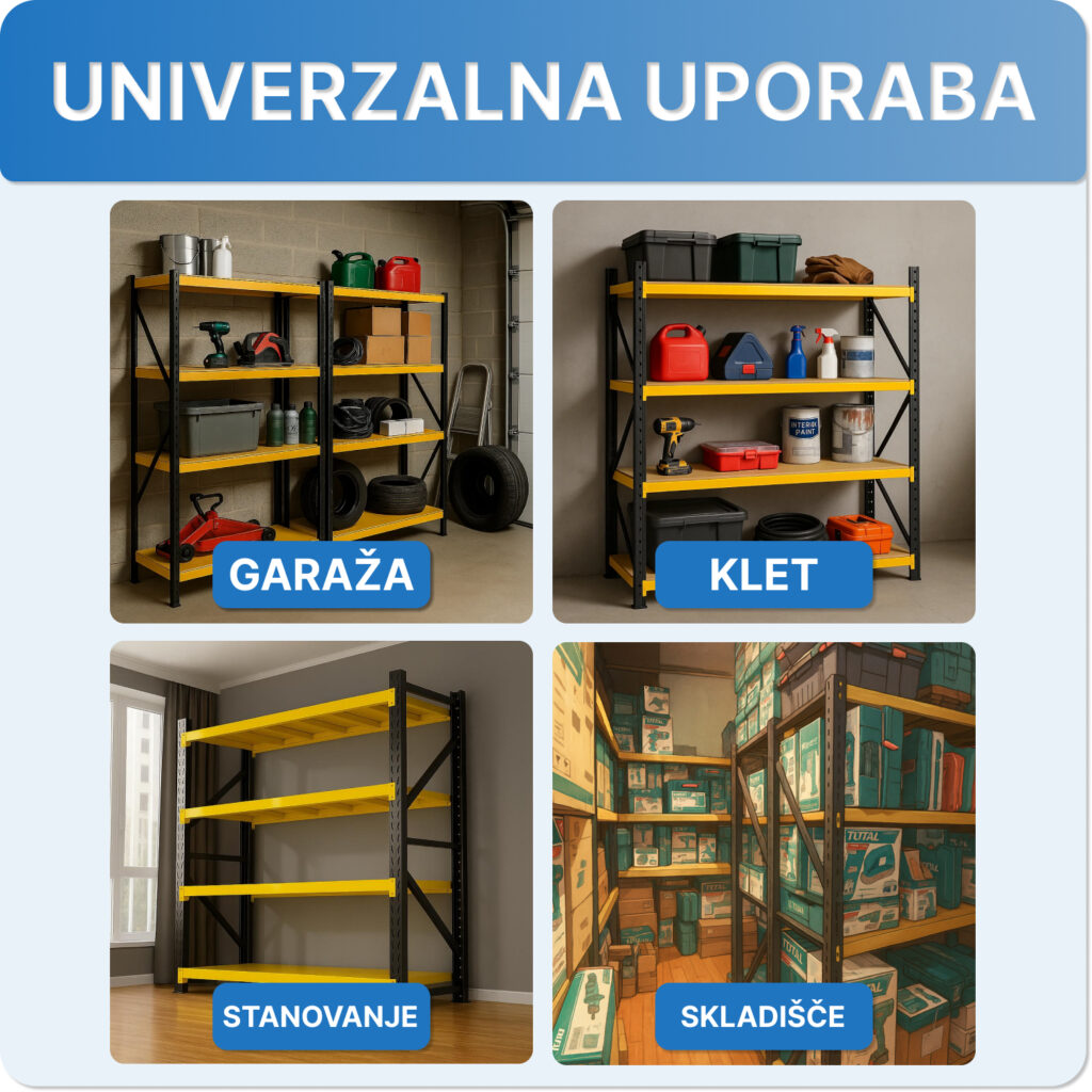 Zaradi trdne konstrukcije in nevtralnega industrijskega dizajna je regal primeren za širok spekter uporabe. Idealen je za garaže, kleti, delavnice, shrambe, skladišča in tudi stanovanjske prostore. Ne glede na to, ali gre za profesionalno ali domačo uporabo, ponuja zanesljivo in vsestransko rešitev za shranjevanje.