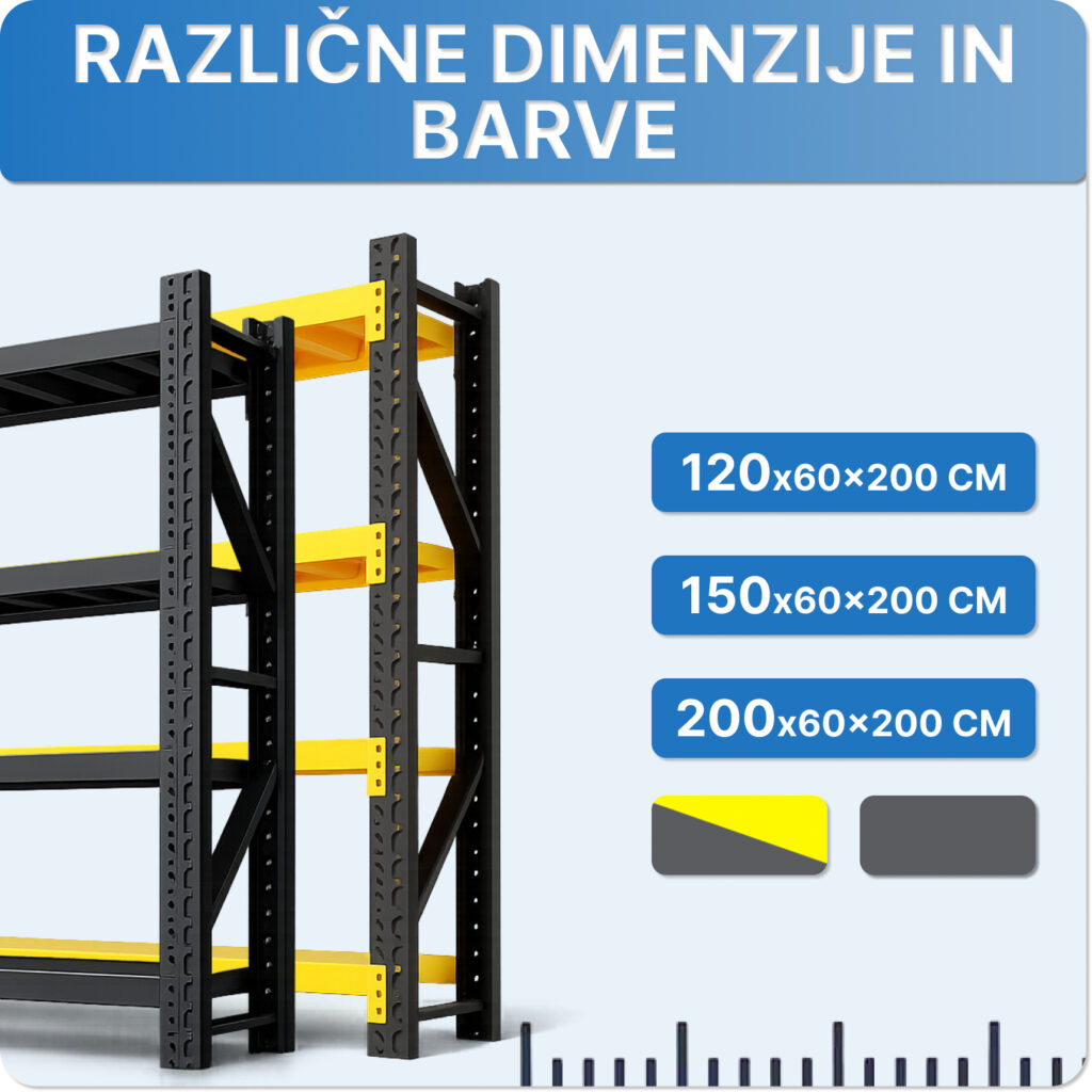 Regalni sistem je na voljo v več različnih dimenzijah, kar omogoča izbiro konfiguracije, ki najbolje ustreza razpoložljivemu prostoru in potrebam shranjevanja. Ne glede na to, ali potrebujete kompaktno rešitev za manjše prostore ali večji regal za delavnice in skladišča, vse velikosti ponujajo enako trdno konstrukcijo in nosilnost polic. Ta prilagodljivost omogoča enostavno prilagajanje različnim postavitvam in prihodnjim potrebam.